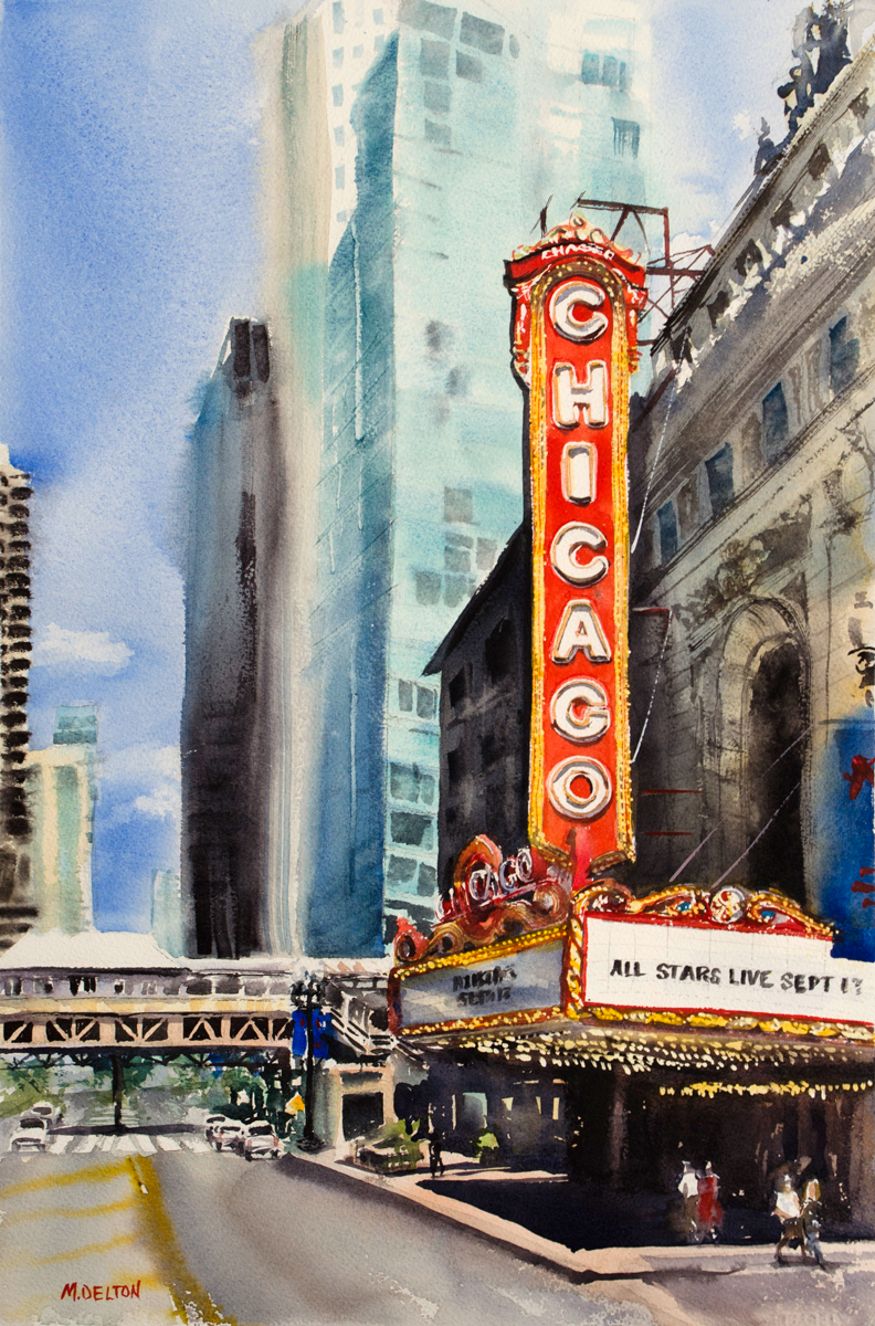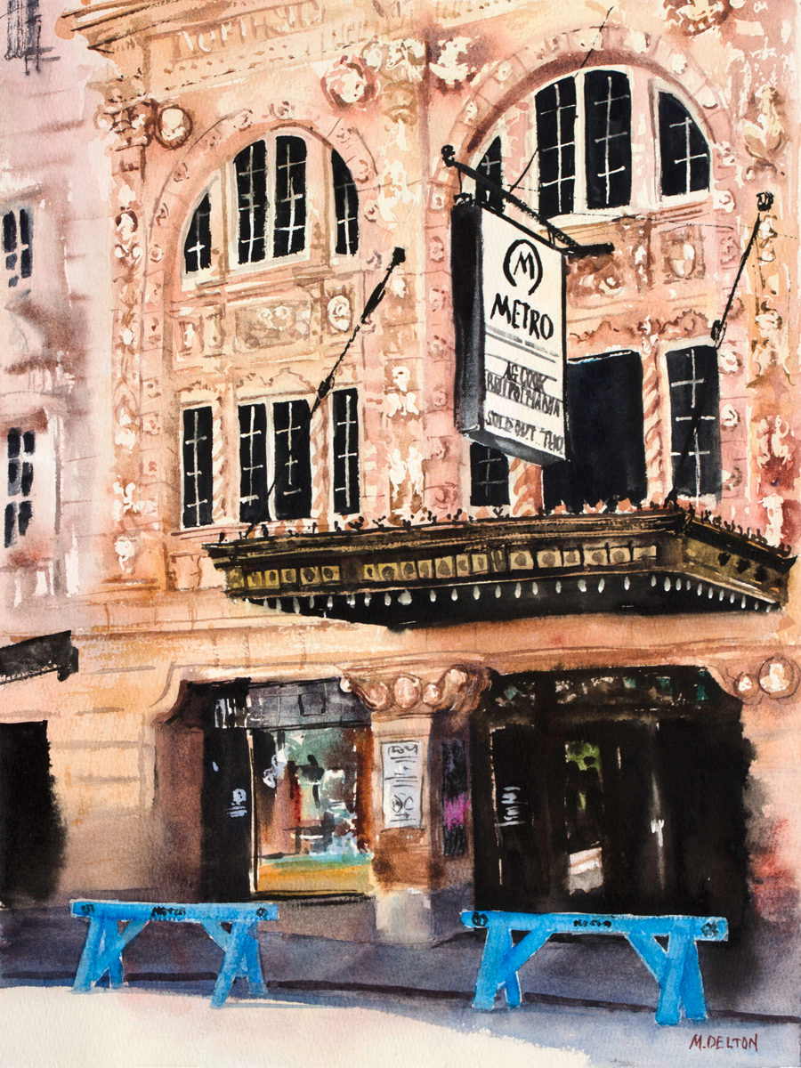 Standing across the street from this neighborhood landmark, you can’t help but be in awe of the architecture. I used multiple watercolor techniques to capture and suggest the myriad of details in the building. The theater is located on Milwaukee Avenue, at the heart of Six Corners.