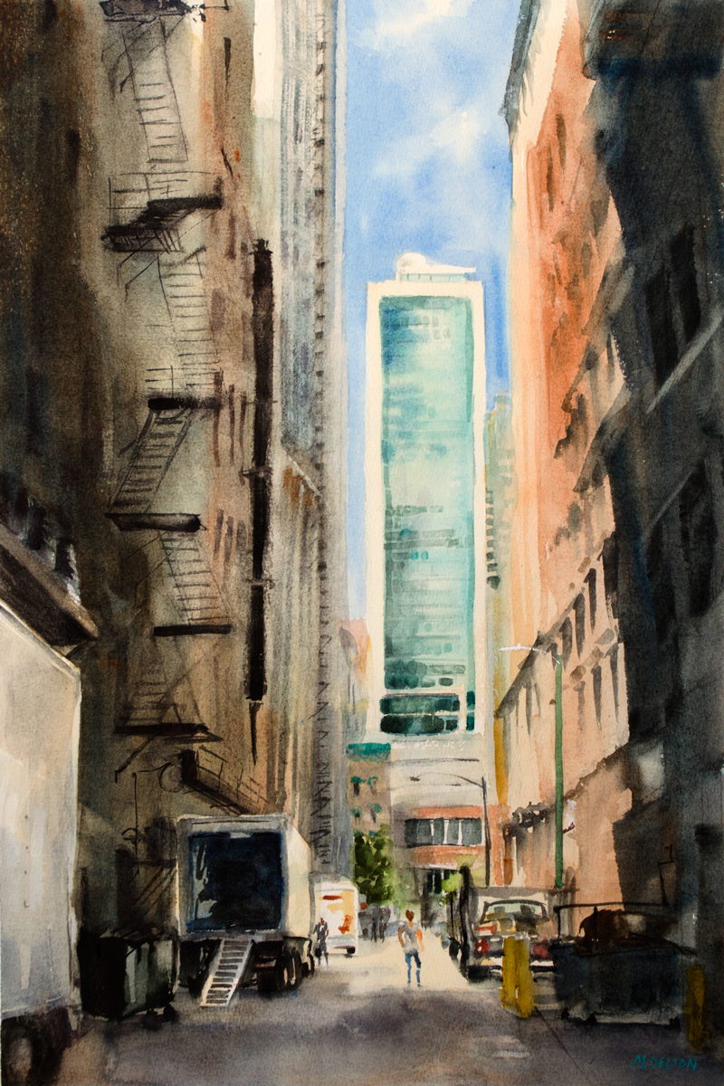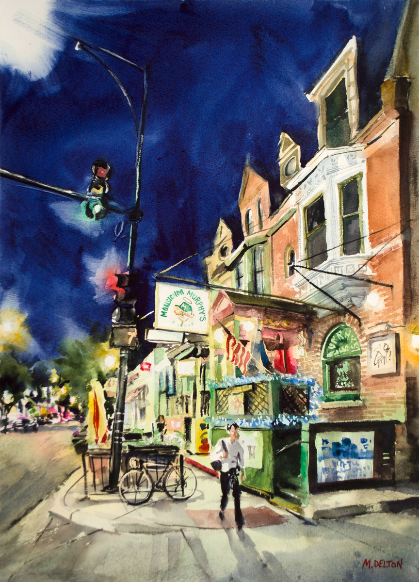 love how the Logan marquee casts a glow on everything around it and I enjoyed playing with the contrast of the cooler LED lighting across the street. The background sky and tree were painted all in one go and that’s watercolor at its best.