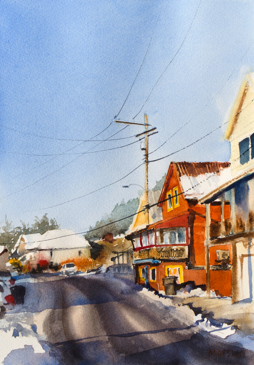 Watercolor is the perfect medium to capture the magic of colorful, reflected lights on wet pavement, transforming a dreary winter scene into something fantastic.