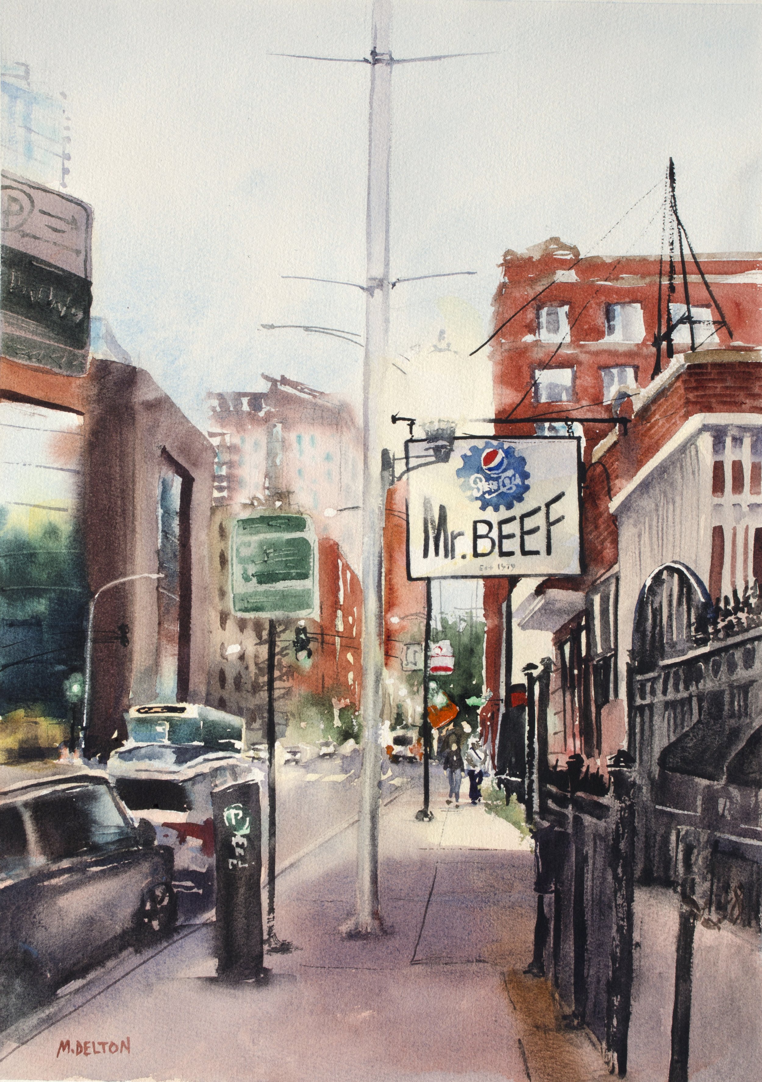 Standing across the street from this neighborhood landmark, you can’t help but be in awe of the architecture. I used multiple watercolor techniques to capture and suggest the myriad of details in the building. The theater is located on Milwaukee Avenue, at the heart of Six Corners.